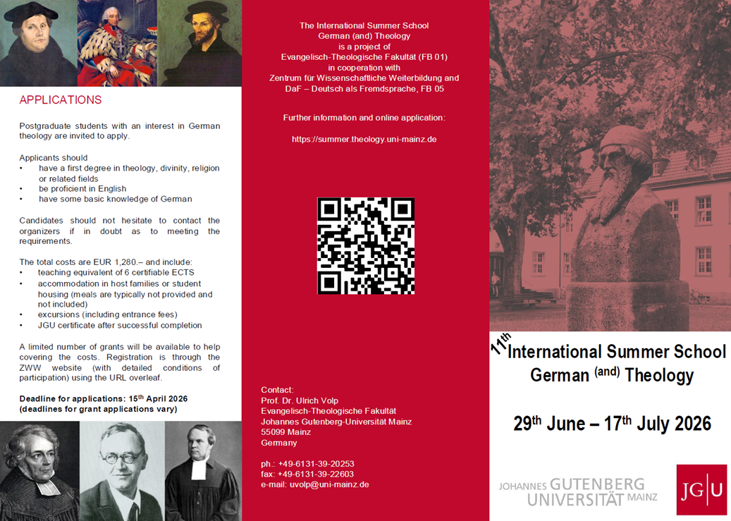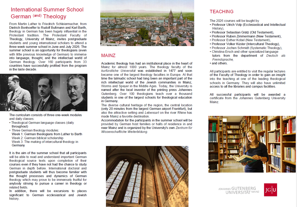Das dreiwöchige Programm findet vom 29. Juni bis 17. Juli 2026 an der Evangelisch-Theologischen Fakultät der JGU statt. Informationen zum Programm finden Sie als PDF anbei oder online unter: https://summer.theology.uni-mainz.de/.